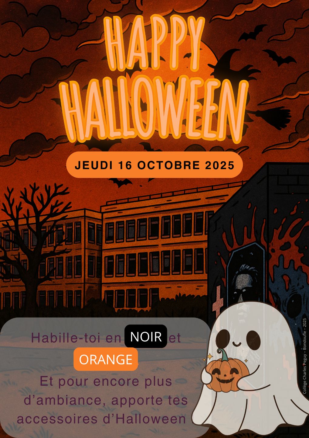 C’était Halloween au Collège Charles Péguy : Tenue de rigueur Orange et noir Elèves et enseignants on joué le jeu. Les photos permettront de rapporter une belle somme au FSE Merci à tous !